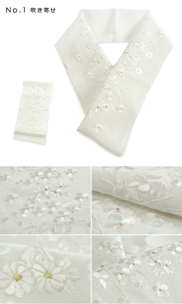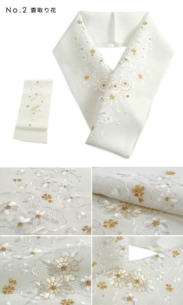 色柄 白地 金糸入り白刺繍 ※全10柄からお選びください No.1 吹き寄せ No.2 雲取り花 No.3 雪輪に花 No.4 手鞠に花 No.5 花に笛 No.6 梅菊牡丹 No.7 月輪に花 No.8 花に鼓 No.9 扇に花 No.10 鶴に花の丸 相性ぴったりな着物! 振袖、袴、留袖、訪問着、小紋 着用シーン 成人式、卒入学式、結婚式、華やかなパーティーなどに ちょっと気取って行きたいお出掛けやお食事会にも お手入れ 刺繍が施されてありますので、クリーニング店へのご相談をお勧めします。