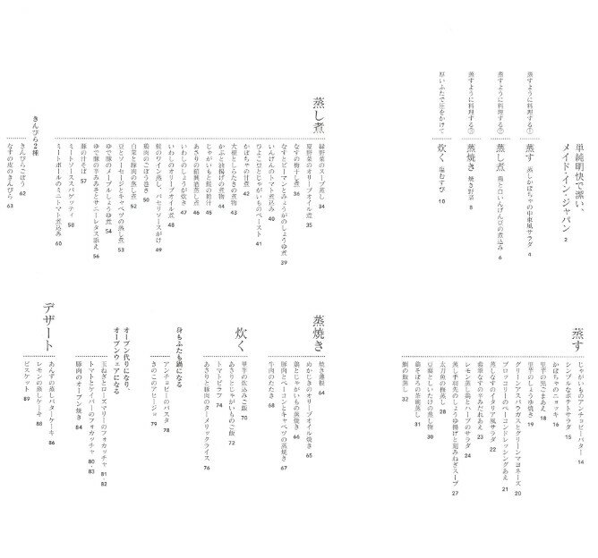 基本となる「蒸す」「蒸し煮」「蒸焼き」「炊く」のほか、「きんぴら」「身もふたも鍋になる」「オーブン代りになり、オーブンウェアになる」「デザート」まで、無水鍋の幅広い使い方の提案書となっています。